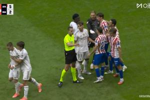 体育资讯09月28日讯 马竞vs皇马最后时刻爆发冲突,马斯坦托诺被拉开,慢镜头给到,马斯坦托诺一脚爆射场边。