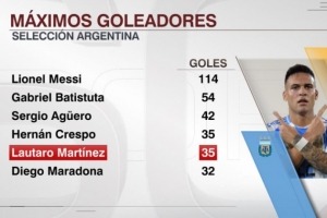 体育资讯10月15日讯 劳塔罗在阿根廷队大胜波多黎各的友谊赛中梅开二度,根据ESPN统计,劳塔罗阿根廷队进球数追平克雷斯波,并列队史第四。