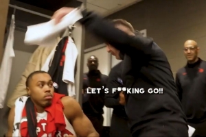 体育资讯10月23日讯 今天猛龙138-118老鹰取得赛季开门红,主教练达科-拉贾科维奇心情大好,赛后在更衣室里激情向球员中怒吼并疯狂庆祝,离他最近的斯科蒂-巴恩斯被吓得缩成一团。