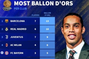 体育资讯9月22日讯 德国转会市场统计了各个俱乐部和球员赢得金球奖的次数,并列出榜单。其中巴萨7人13次居首,皇马6人10次第二,尤文图斯7人9次排名第三。
